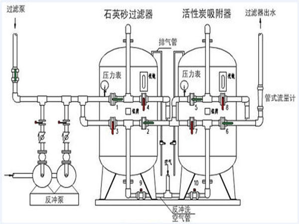 國內外廣泛使用的是填充石英砂、活性炭兩種濾料的多介質過濾器,利用石英砂生物截污能力,可以有效的去除水中的大顆粒物,膠體,懸浮物等;利用活性炭的吸附能力,可以有效的去除水中的余氯、顏色、異味等。