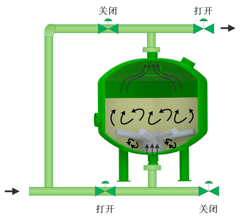 淺層砂過濾器由若干個(gè)過濾單元并列組合而成。當(dāng)系統(tǒng)處于過濾狀態(tài)時(shí),未經(jīng)過濾的水通過自行研制獨(dú)特的布水器均勻布水,水以層流狀態(tài)通過濾器內(nèi)的填料層(精制均粒石英砂/石榴石)。當(dāng)水流過填料層時(shí),雜質(zhì)被截留在填料層內(nèi)。過濾器底部有多個(gè)均勻分布的集水器,將過濾后的水均勻地收集并引出,平流過濾,可以使過濾器在高流速下過濾,仍可達(dá)到較好過濾的效果。