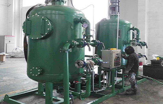 反洗狀態: 隨著雜質在填料層中不斷聚積, 內部壓頭損失將不斷增大。當進、出水壓頭損失達到設定值時,系統將自動激活定壓差裝置使其轉換至反洗狀態,電機帶動攪拌器在罐體內轉動,更便于清洗聚積起來的雜質。當系統處于反洗狀態時,水的流向由底部向上流動,電機帶動攪拌器充分清洗濾料,由排污口直接流出。反洗后系統回復正常過濾狀態.