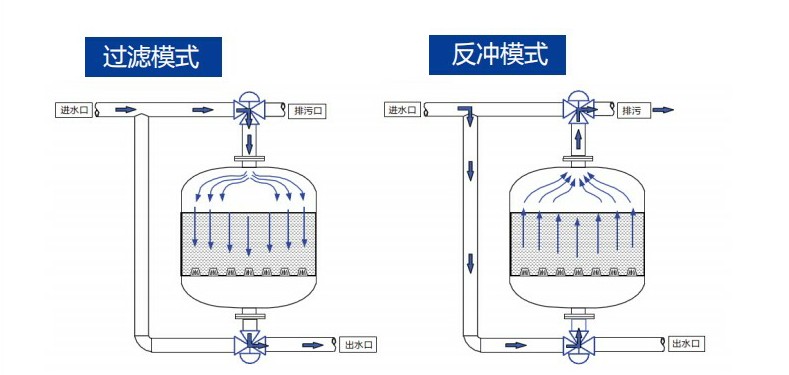 隨著雜質(zhì)在填料層中不斷聚積 , 內(nèi)部壓頭損失將不斷增大。當進、出水壓頭損失達到設(shè)定值或達到設(shè)定時間時 , 系統(tǒng)將自動激活定壓差裝置使其轉(zhuǎn)換至反洗狀態(tài) , 當此臺反洗結(jié)束,水力閥改變給水方向從而實現(xiàn)逐臺反洗 , 更便于清洗聚積起來的雜質(zhì)。