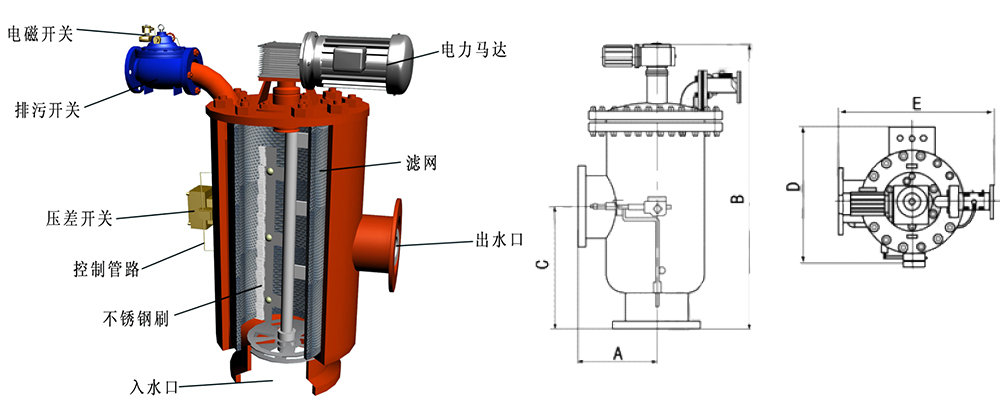 直通式自清洗過濾器主要由:筒體、電機不銹鋼網、鋼刷、及電器控制部分組成,其工作原理與其他形式自清洗原理相同,污水從進水口進入過濾器濾筒內部,雜質被攔截在過濾筒內壁,過濾后的干凈水從出水口流出,當濾筒內壁的雜質越積越多時,過濾器進出水口的壓差達到預設值或達到清洗時間或手動預制時,過濾器將開始自清洗過濾器,整個字清晰過程包括兩個步驟:打開位于過濾器上的自動排污閥;電機帶動過濾器濾網內的清洗刷,被濾網所攔截下來的雜質從排污閥排出。清洗時系統不斷流,過濾器的整個運行過程有隨機配備的一個智能控制箱來控制。結構示意圖如下: